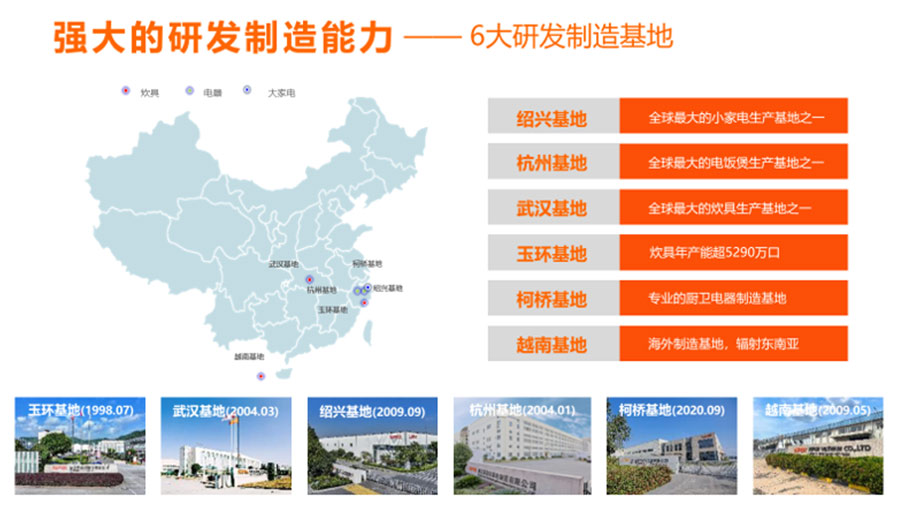浙江蘇泊爾股份有限公司是中國最大、全球第二的炊具研發制造商之一,中國廚房小家電領先品牌。在杭州、玉環、紹興、武漢和越南建立了5大研發制造基地,擁有1萬多名員工。蘇泊爾是中國炊具行業首家上市公司(股票代碼002032)。浙江蘇泊爾家電制造有限公司是浙江蘇泊爾股份有限公司的控股子公司,注冊資本13369萬元,自2004年1月成立,主要生產電飯煲、電蒸鍋、電燉鍋、煎烤器等廚房小家電產品。2023年營收達到40.83億元,擁有2100多名員工,目前為中國最大的電飯煲生產基地之一。
