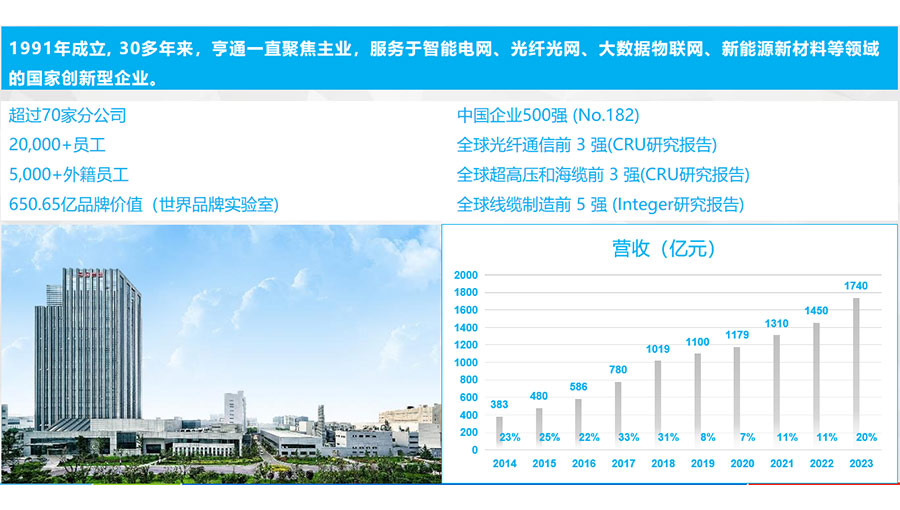 主要產品:“亨通”通信電纜、電力電纜、特種導線、電氣裝備用電纜、新能源汽車線纜、電纜附件及新能源汽車用線束、連接器、充電樁、充電槍、配電柜等配件與設備